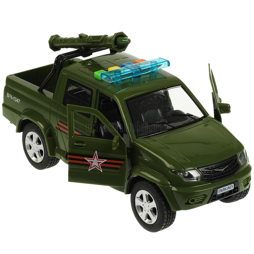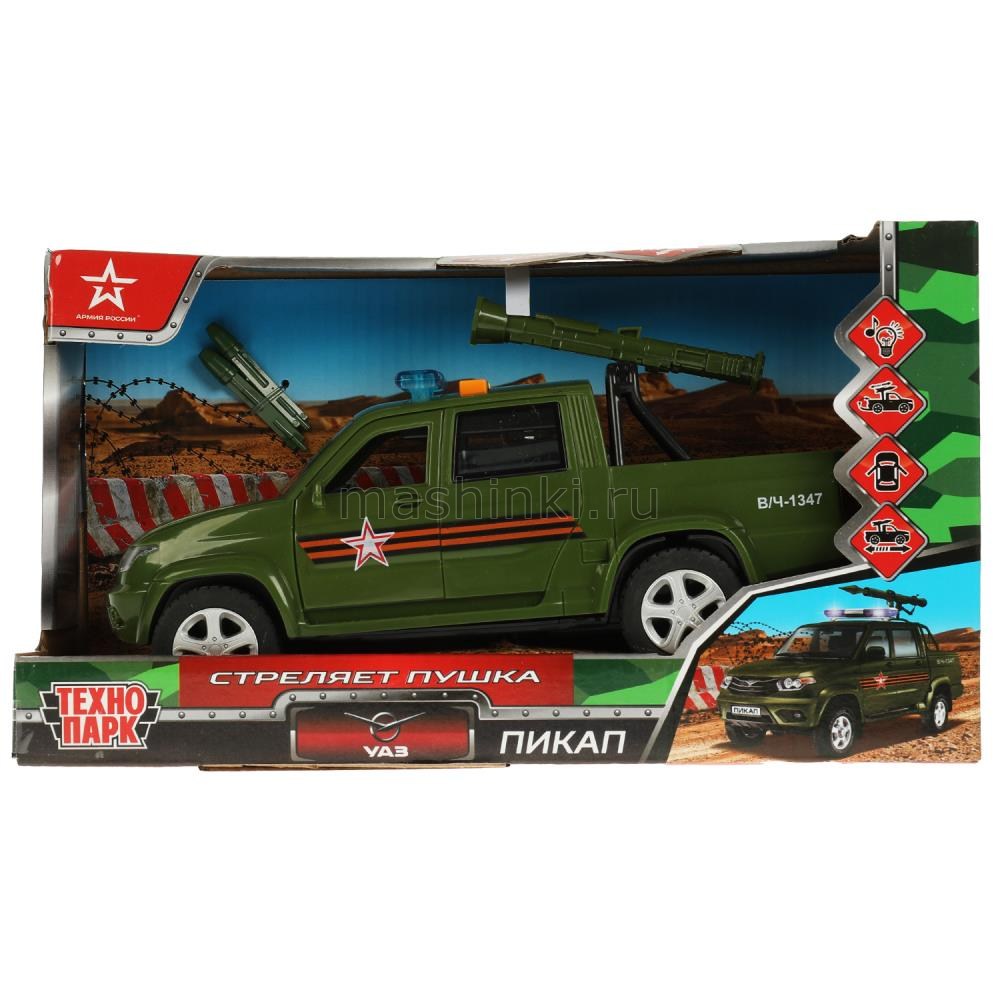 ТЕХНОПАРК УАЗ пикап военный 22 см 4 кнопки (свет, звук, пушка стреляет) пластм. хаки откр. коробка
